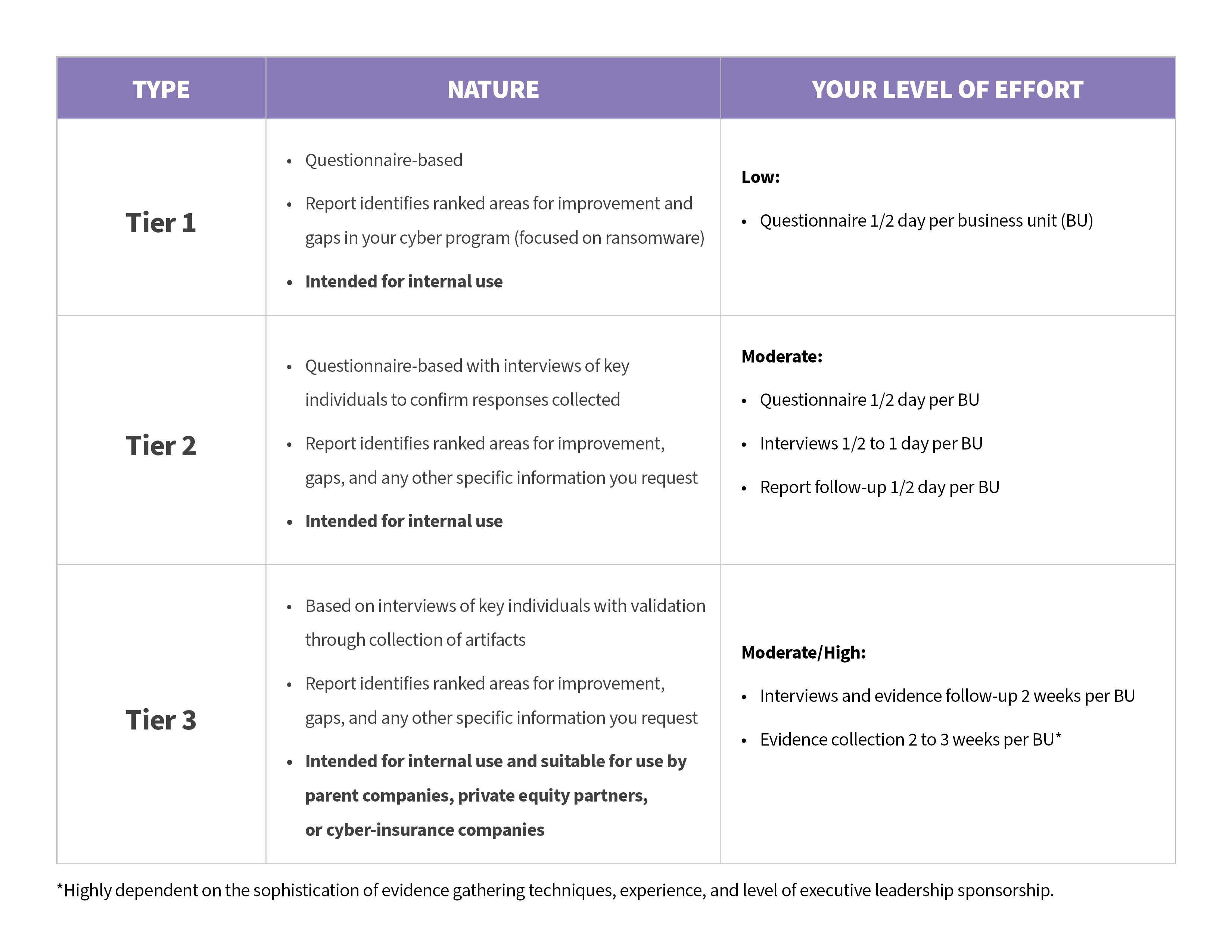 We offer three different tiers of this assessment, and they vary based on your necessary effort and what kind of report we provide: